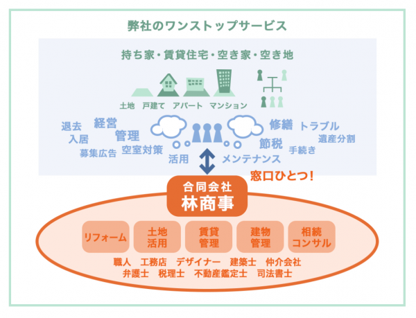 合同会社 林商事は持ち家、遊休不動産、賃貸住宅に関する現在お抱えの問題に解決のご提案から実施・アフターフォローまで窓口ひとつで担います。