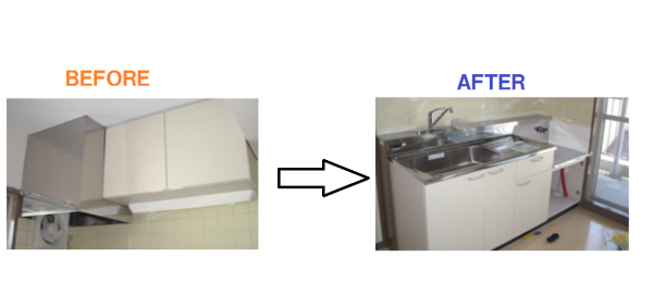 吊戸棚と手元灯、流し台とガス台の取替えを行いました。