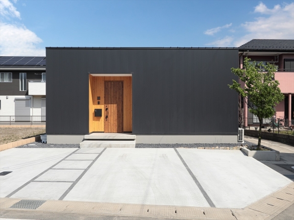 黒のガルバリウムの外壁に、板張りの木目が美しい玄関とウッドデッキの目隠しルーバーがアクセント