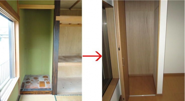 和室から洋室にリフォームしたお部屋です。床の間を収納スペースに、今までの押入部分はフローリングにし、お部屋を広くしました