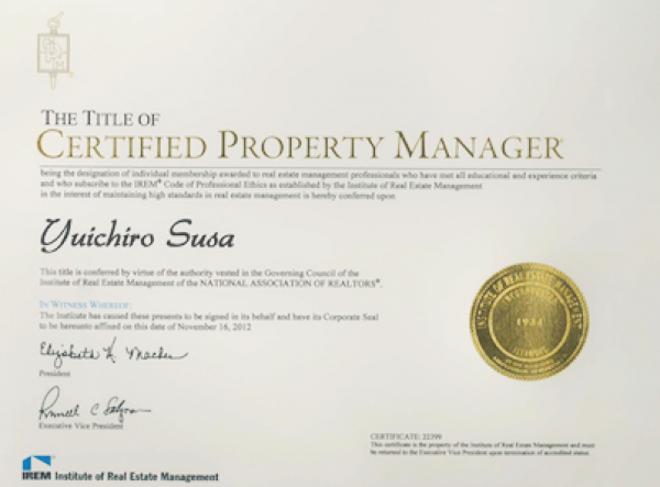 CPM®とは、全米不動産管理協会(IREM)が認定する不動産経営管理士のことで、米国におけるプロの不動産管理者としての知識の育成や能力の向上を目的とした教育プログラムを受講し一定の試験に合格した者に与えられる最高峰の認定資格です。