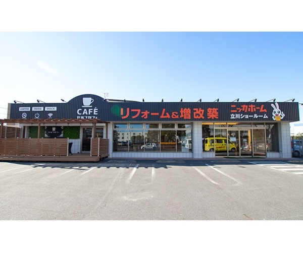 ニッカホーム立川ショールームは、多摩モノレール「泉体育館」駅より徒歩5分ほどの芋窪街道沿いにショールームを構えております。 ニッカホームのオレンジと黒の看板が目印です! 水まわり(キッチン・ユニットバス・洗面化粧台・トイレ)商品の展示はもちろんのこと、駐車場完備のカフェ併設型店舗となっておりますので、リフォームのご相談以外でも気軽にお立ち寄りください! スタッフ一同お客様のご来店を心よりお待ちしております。