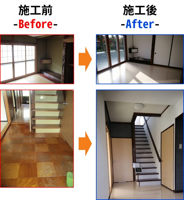 もともと和室のみの和風のお宅でしたが、今回、床をフローリングにし、壁もクロスを張替した事で、とてもオシャレな部屋になりました。